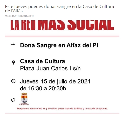l’Alfàs.- DONACIÓN DE SANGRE HOY A POARTIR DE LAS 16’30
