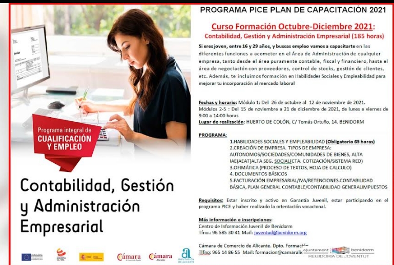 Para la realización de este curso, Juventud cuenta con la colaboración de la Unión Europea (Fondo Social Europeo), el Programa Garantía Juvenil del Ministerio de Trabajo y Economía Social, la Diputación de Alicante y la Cámara de Comercio.