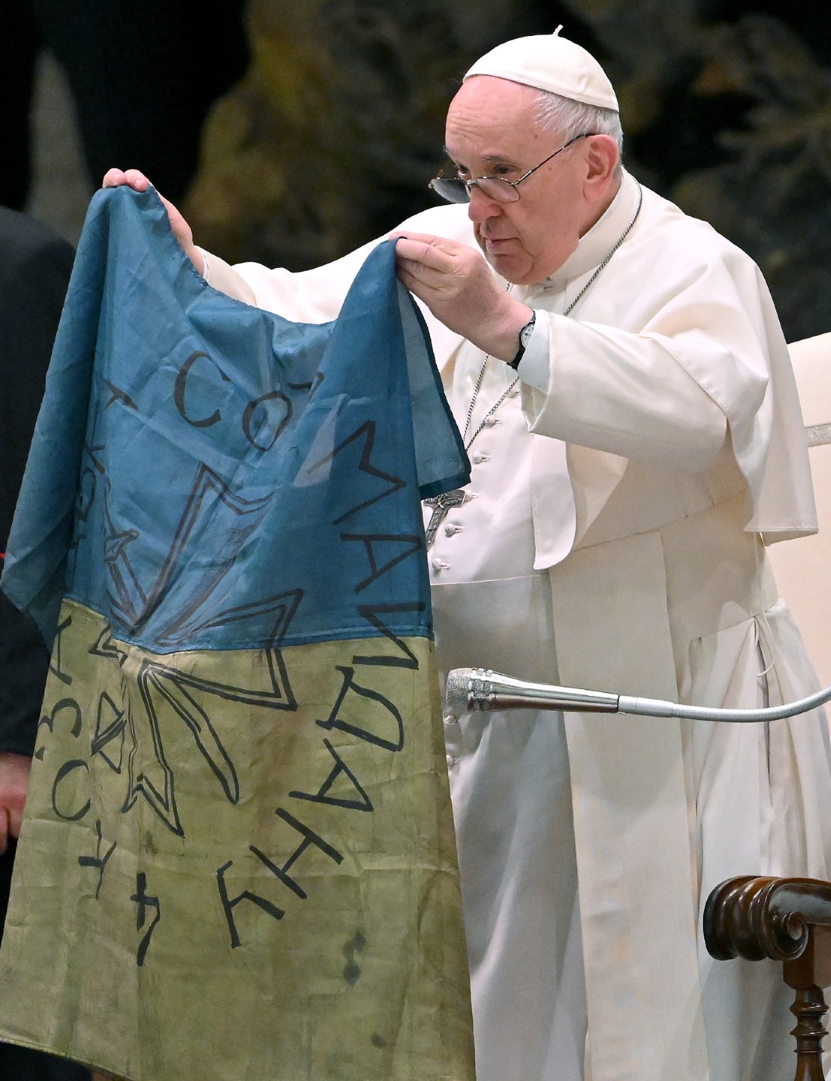 - 10:50El papa Francisco muestra una bandera ucraniana enviada desde la ciudad de Bucha, masacrada por las tropas rusas, durante la audiencia general de los miércoles en el Vaticano. FOTO: EFE/EPA/ETTORE FERRARI