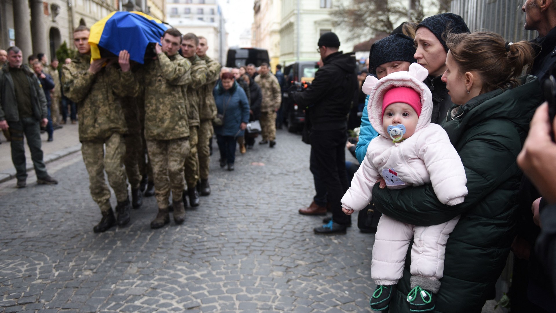 Hostomel es otra de las localizaciones al noroeste de Kiev que durante un mes ha sufrido el castigo de las tropas rusas. Más de 400 personas se encuentran desaparecidas y las autoridades están tratando de averiguar cuántas huyeron sin comunicarlo y cuántas pueden haber fallecido. La ciudad es un punto estratégico debido al aeródromo construido durante la época soviética del que podría haber hecho uso el ejército del Kremlin en caso de haber mantenido la posición durante más tiempo. Una crónica del enviado especial de RTVE Fran Sevilla. - 14:49La vida y la muerte se dan la mano en la imagen del entierro de un soldado en la ciudad ucraniana de Lviv. Varios hombres uniformados cargan el féretro a hombros, mientras una bebé en brazos de su madre mira al fotógrafo. FOTO: Yuriy Dyachyshyn / AFP