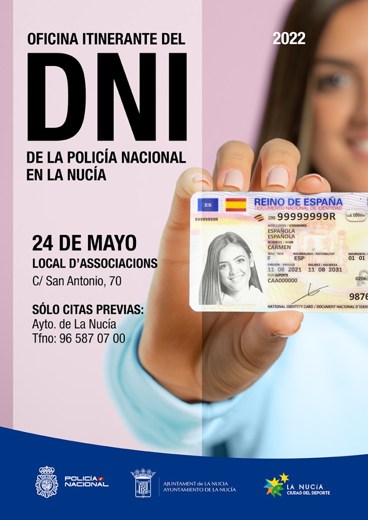 La oficina itinerante del DNI de la Policía Nacional vuelve a La Nucía el martes 24 de mayo de 2022. La oficina Itinerante del DNI se situará en el Local d’Associacions y atenderá sólo citas previas, que se dan en el Ayuntamiento de La Nucía (96587 07 00). El cupo por visitas está en 100 citas, por lo que las plazas son limitadas.