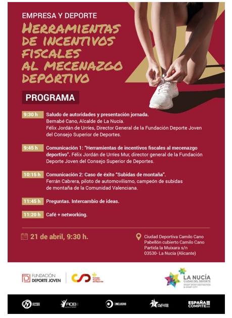 Esta jornada “Empresa y Deporte. Herramientas de incentivos fiscales al mecenazgo deportivo” en La Nucía se desarrollará el jueves 21 de abril en la Sala de prensa del Pabellón Camilo Cano de La Nucía. Comenzará a las 9,30 de la mañana y finalizará sobre las 12 horas. Jornada que contará con dos comunicaciones: “Herramientas de incentivos fiscales al mecenazgo deportivo” por Félix Jordán de Urríes Mur, director general de la Fundación Deportes Joven del CSD y “Casos de éxito. Subidas de Montaña” por Ferrán Cabrera, piloto de automovilismo y campeón de subida de montaña C.V.