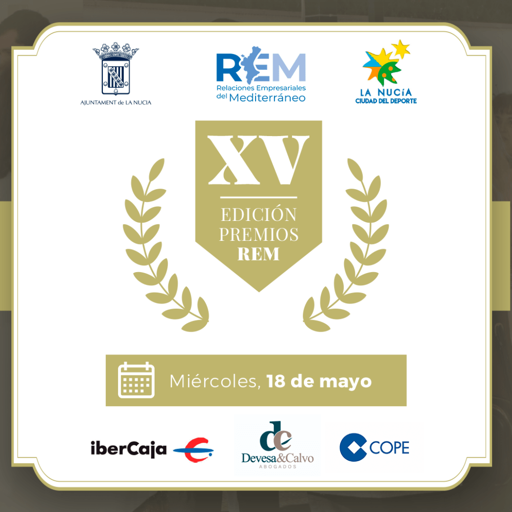 La plataforma empresarial REM premiará en la decimoquinta edición de entrega de premios a los siguientes directivos y empresas galardonadas: Calconut, Ambiseint, Surinver, Confederación Española de Comercio, Gaviota Group, VOI. Scooters, Restaurante El Xato La Nucía, Grupo Soledad, Carlos Alcaraz Garfia (tenista), Germanie de Capuccini, Seoriginalsweb (empresa Lab Nucia), Neumáticos Soledad y Bodegas Cerdá.