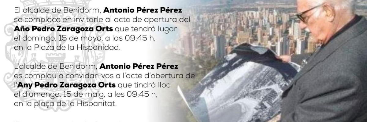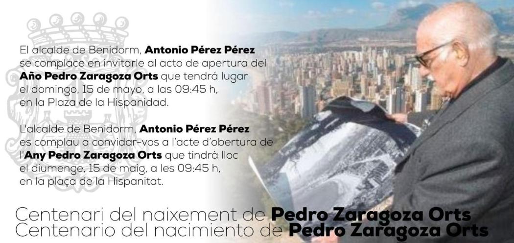 El alcalde, Toni Pérez, ha invitado a la ciudadanía “a participar de la apertura del ‘Año Pedro Zaragoza Orts’ y del resto de actos que se programarán desde este domingo hasta el 14 de mayo de 2023”. Unos actos, ha precisado, en los que “a lo largo del año a través de la figura de Pedro Zaragoza Orts, residentes y visitantes podrán recorrer y conocer más en detalle algunos de los pasajes más determinantes de las últimas seis o siete décadas y que han sido claves para la configuración de la ciudad moderna, tanto desde el punto de vista turístico como urbanístico, y que también lo son para entender la historia reciente de Benidorm”.