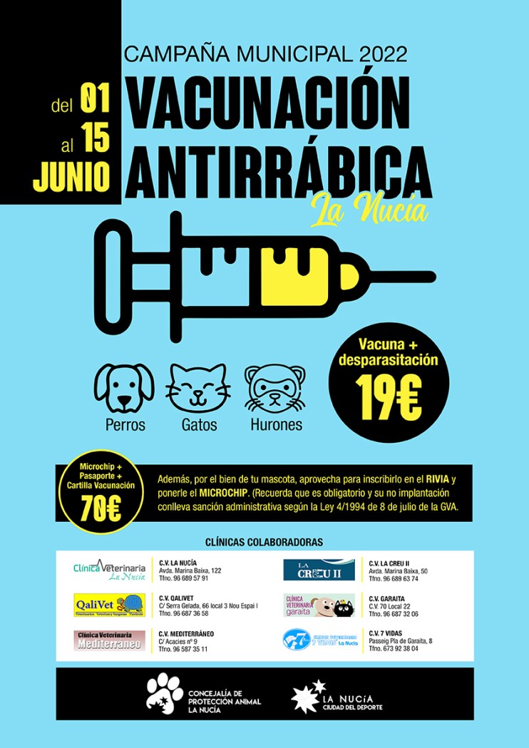 Hoy 1 de junio comienza la “Campaña Municipal de Vacunación Antirrábica 2022” que concluirá el 15 de junio. La concejalía de Protección Animal ha llegado a un acuerdo con seis Clínicas Veterinarias de La Nucía para que el precio de la vacuna y desparasitación del animal sea de 19 €, para empadronados y empadronadas en La Nucía.