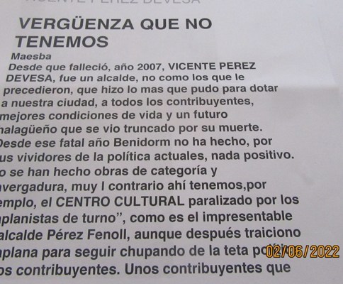 Ambos eventos de homenaje deberían de haber salido de la Alcaldía de nuestra ciudad, no de la Fundación Frax. Me ratifico el eso de “VERGÜENZA QUE NO TENEMOS” y no la tenemos precisamente los vecinos, en su mayoría, es el alcalde actuar, ANTONIO PEREZ, el que debería haberse adelantado a la Fundación Frax pero la falta de ética y decencia política, su total incapacidad conocimiento político hace que estos dos exalcaldes benidormenses hayan sido utilizados por otra población de la comarca, Alfas, a la que debemos agradecérselo hay quitarnos el sombrero, ¡el que lo tenga y lo lleve puesto!, por el gesto.