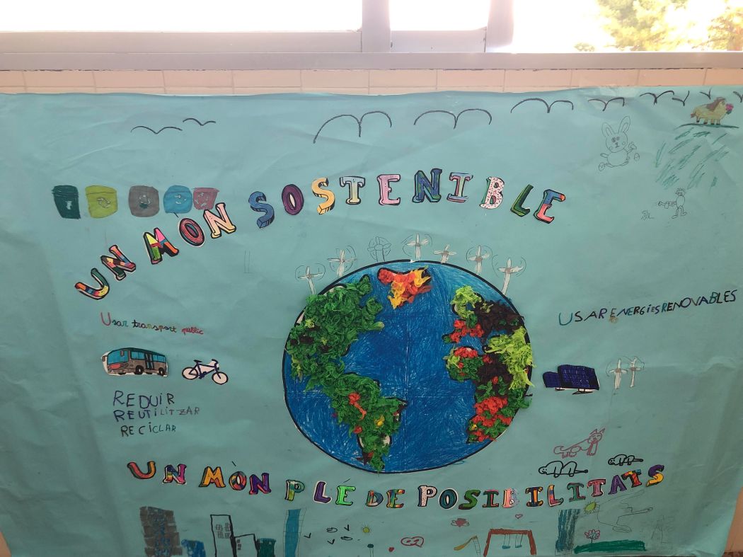 Los alumnos de 2ºB decidieron dedicar su mural, “Un món sostenible, un món ple de possibilitats” a recordar la importancia de adoptar hábitos respetuosos con el planeta, como usar el transporte público, las energías renovables o separar los residuos en los cinco contenedores. La pieza central es el planeta Tierra, coronado por molinos de energía eólica.