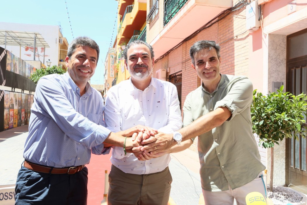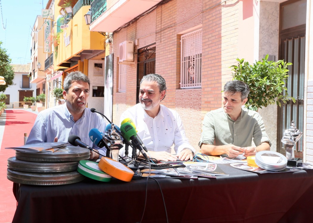 El presidente Carlos Mazón, firma el convenio de colaboración con el alcalde de la localidad, Vicente Arques, y el director del certamen, Luis Larrodera