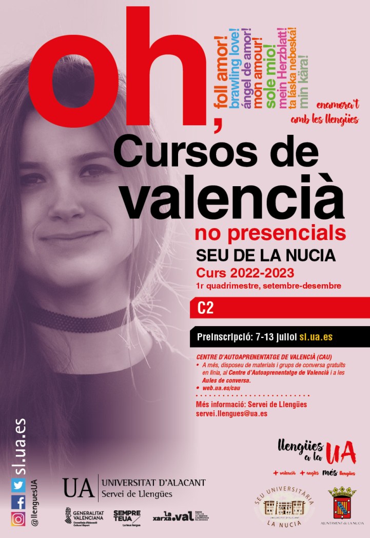 Para inscribirse hay que acreditar poseer el C1 (nivel mitjà valencià). El plazo de inscripción para este “Curs Superior de Valencià” (C2) será del 7 al 13 de julio en el Servei de Llengües de la Universitat d’Alacant (https://sl.ua.es/va/). Es un curso de 60 horas que tendrá dos video clases a la semana por la tarde (lunes y miércoles de 18 a 20 horas), durante el primer cuatrimestre del curso 2022-2023, del 12 de septiembre al 21 de diciembre. Es un curso no presencial, en formato on-line.