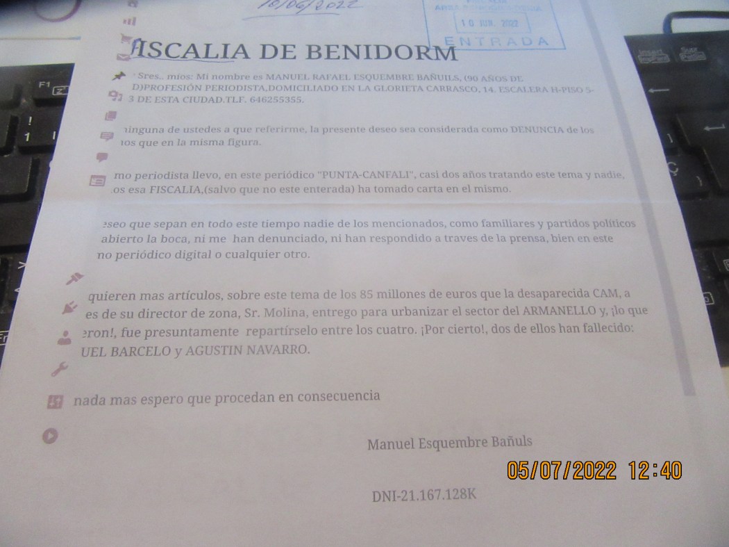 OTRA DENUNCIA POR EL SUPUESTO REPARTO DE 85 MILLONES EUROS ENTRE MIGUE BARCELO, MANUELPEREZ FENOLL, AGUSTIN NAVARRO Y DIRECTOR ZONA DE LA CAM, MOLINA