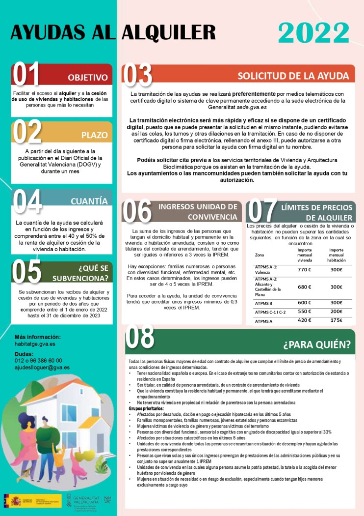 El Ayuntamiento de La Nucía informa que se ha abierto el plazo para solicitar las “Ayudas Alquiler de vivienda 2022-2023” de la Generalitat Valenciana, que finalizará el 1 de agosto. Este año como novedades esta línea de ayudas comprenden 2 años (2022 y 2023) y es posible solicitar la ayuda tanto para viviendas como para habitaciones en alquiler.