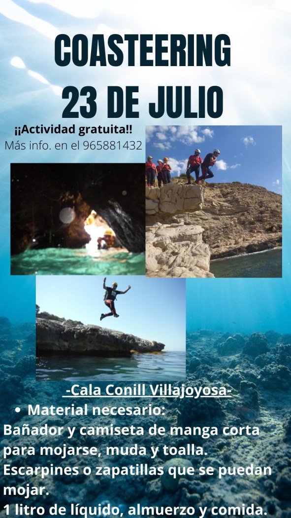 El próximo sábado 23 de julio a las 10h. está programada una actividad de Coasteering en la cala Conill de Villajoyosa para todos los habitantes del municipio de Bolulla que deseen participar. Esta actividad está subvencionada por la Excma. Diputación de Alicante.