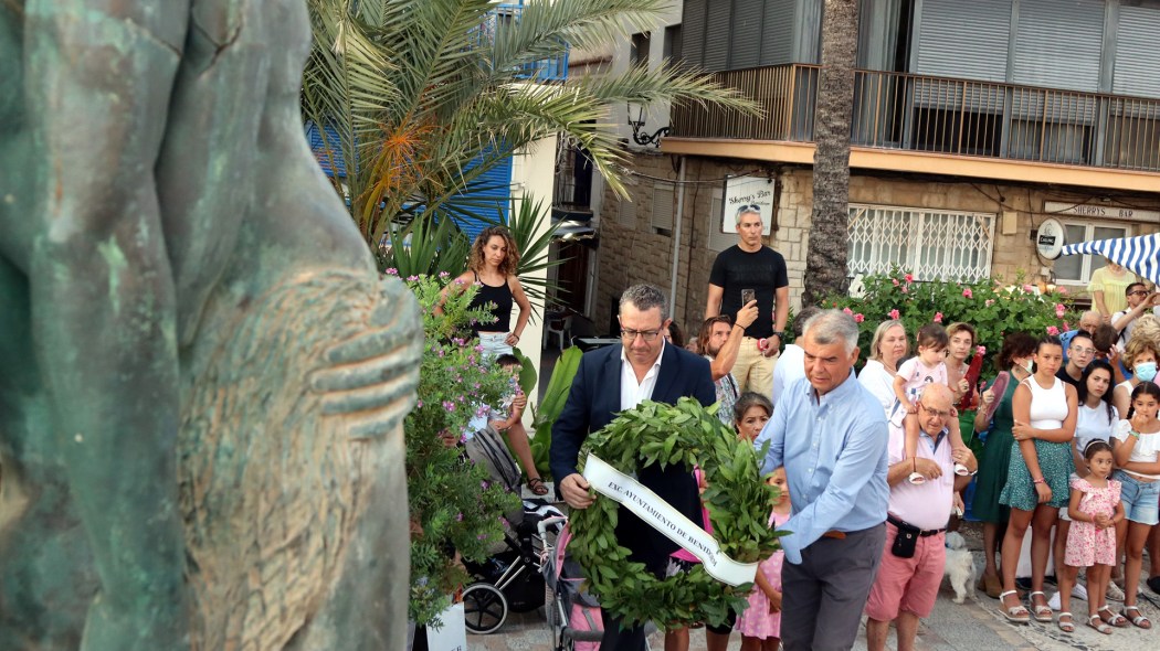 Tras ofrendar a la patrona, en la misma plaza y ante el monumento a los caídos en el mar del artista Juan de Ávalos, el alcalde, Toni Pérez, y el concejal de Fiestas, Jesús Carrobles, depositaron una corona de laurel en memoria de los benidormenses que perdieron la vida en el mar. A ésta se unieron las ofrendadas por el presidente de las Fiestas del Carmen, Ginés Alvarado, la Marinera del Honor, Sofía Fuster, el patrón mayor de la Cofradía de Pescadores de Benidorm, José Martínez; y por las Reinas de les Festes Majors Patronals, Aila Merenciano y Chloe d’Hebboudt, y el presidente de la Comissió, José Vicente Fuster.