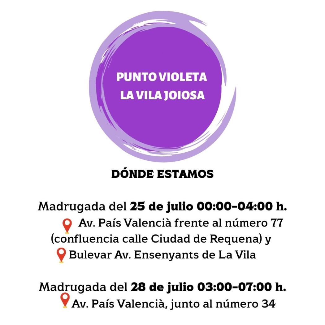 En concreto se ubicará un punto físico de sensibilización e intervención en la avenida del País Valencià a la altura de Correos la madrugada del 25 de julio, primera noche de fiestas, en horario de 00h a 4h de la madrugada, y la madrugada del Desembarco, noche del 27 al 28 de julio, de 3h a 7h de la madrugada. La actividad contará con profesionales en materia de prevención y sensibilización y con una psicóloga que hará intervención si hubiera alguna víctima de agresiones sexuales y sexistas. La actividad durante las dos noches de funcionamiento contará con la participación de voluntariado de Cruz Roja con formación específica en materia de Puntos Violetas que irán identificados con camisetas.
