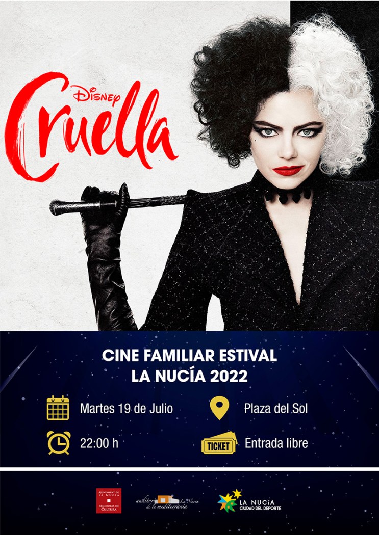La película “Cruella” se proyectará mañana martes 19 de julio a las 22 horas en la plaza del Sol, con entrada libre y gratuita. Será la segunda proyección del Ciclo de Cine Familiar Estival “Noches de película” 2022 que cuenta con un total de 13 proyecciones totalmente gratuitas, al aire libre, en la plaça dels Músics y plaza del Sol de La Nucía.