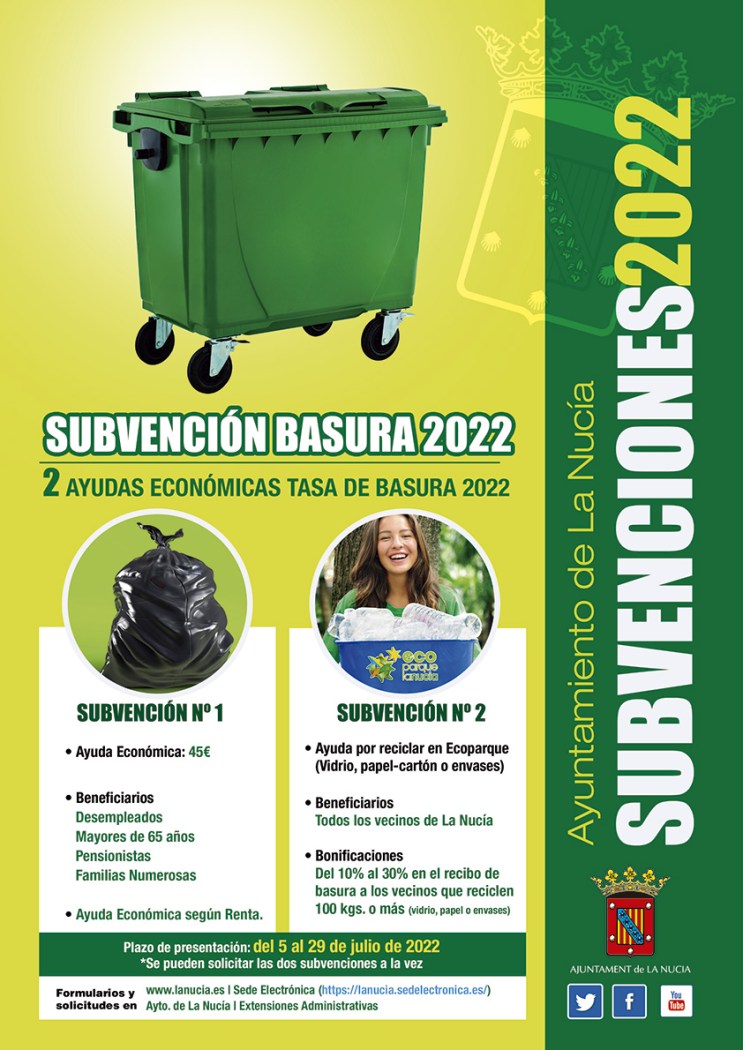 L@s vecin@s pueden solicitar las dos subvenciones de la basura, ya que son compatibles y acumulativas. Las solicitudes podrán tramitarse on-line a través de la sede electrónica del Ayuntamiento de La Nucía (https://lanucia.sedelectronica.es) o físicamente en el Ayuntamiento y Extensiones Administrativas. Las bases estas disponibles en www.lanucia.es. El plazo de presentación de solicitudes para ambas subvenciones comenzó el 5 y finalizará el 29 de julio de 2022.