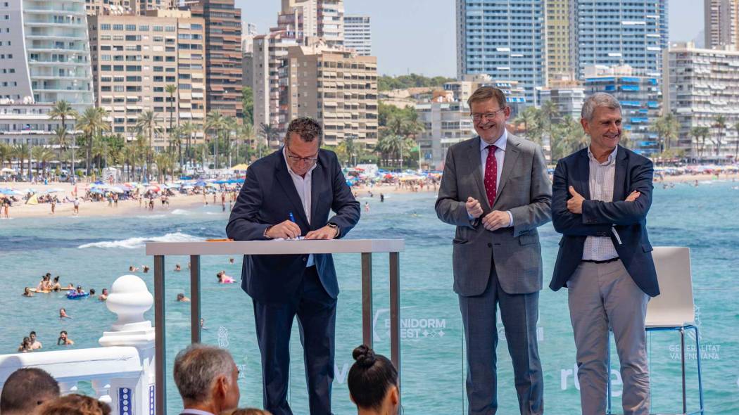 El Benidorm Fest 2023, segunda edición del evento del que saldrá el próximo representante de España en Eurovisión, ya ha echado a andar. Este martes, el alcalde, Toni Pérez; el presidente de la Generalitat Valenciana, Ximo Puig; y el presidente de RTVE, José Manuel Pérez Tornero, han firmado en la ciudad el protocolo general de colaboración entre las tres partes para la organización y desarrollo de la nueva edición del festival.