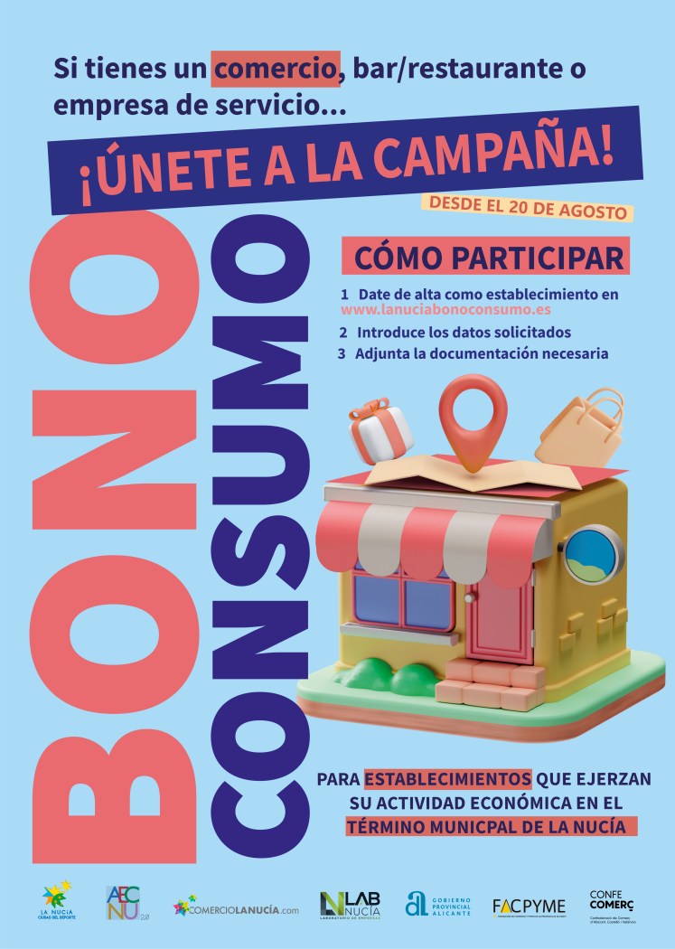 El primer paso de esta “Campaña de Bonos Consumo de La Nucía” será la adhesión de los comercios y servicios de La Nucía a la campaña. Durante las próximas semanas los técnicos de FACPYME realizarán una visita a los comercios, bares, tiendas de La Nucía para explicarles el funcionamiento y adherirlos. Posteriormente a partir del 20 de agosto podrán dar de alta el establecimiento en la web www.lanuciabonoconsumo.es (que estará operativa en esa fecha y no antes)