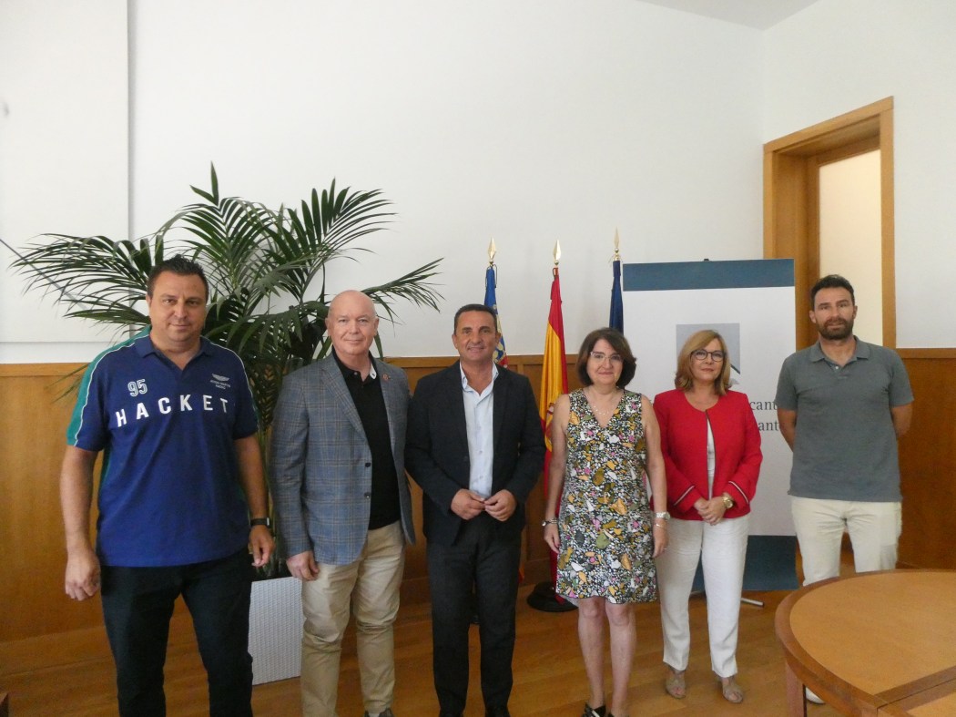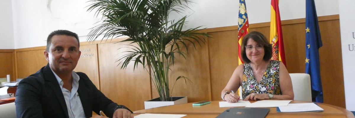 La rectora de la Universidad de Alicante, Amparo Navarro y el alcalde de La Nucía, Bernabé Cano, se han reunido en el despacho rectoral para formalizar el acuerdo en un acto que ha contado con la participación de Esther Algarra, secretaria general de la UA, Roberto Cejuela, director del secretariado de Deportes de la UA y entrenador del equipo de triatlón de la Universidad de Alicante, Vicent Martines, director Seu Universitària de La Nucía y Sergio Villalba, concejal de Deportes.