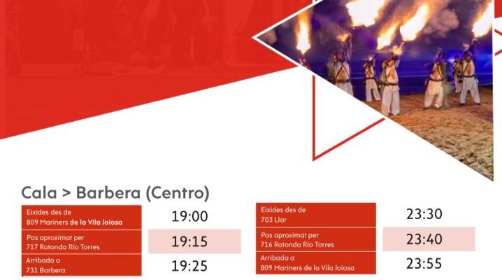 ● Los días 25 y 26 de julio, a partir de las 19.00 horas se fletará un autobús desde la Cala de la Vila Joiosa-Tellerola y otro desde Montiboli-Paradís, para asisitir a los desfiles. La vuelta será a partir de las 23.30 horas desde las paradas de la Barbera dels Aragonés-Llar del Pensionista