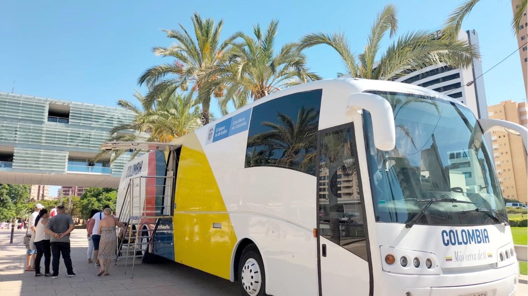 El Consulado itinerante de Colombia ha llegado hoy a Benidorm para ofrecer de forma directa sus servicios a las personas de esta nacionalidad residentes en Benidorm, facilitándoles los trámites que dependen de la organización consular. Durante las jornadas de hoy viernes y mañana, la unidad móvil ‘Colombia Más Cerca de Ti’ estará ubicada en la Plaza de SSMM Reyes de España. Este autobús totalmente equipado tecnológicamente, cuenta con cinco puestos de trabajo y la atención a la ciudadanía está encabezada por la Cónsul de Colombia en Valencia, Rosa María Cárdenas.