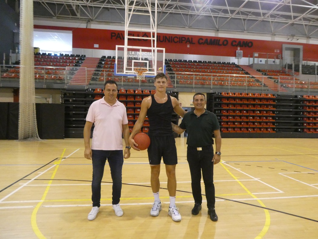 Sergio Villalba, concejal de Deportes y Bernabé Cano, alcalde de La Nucía, han saludado al joven jugador sueco que se encuentra realizando su preparación de cara a una nueva temporada en la liga universitaria estadounidense (NCAA), y está acompañado por su entrenador.