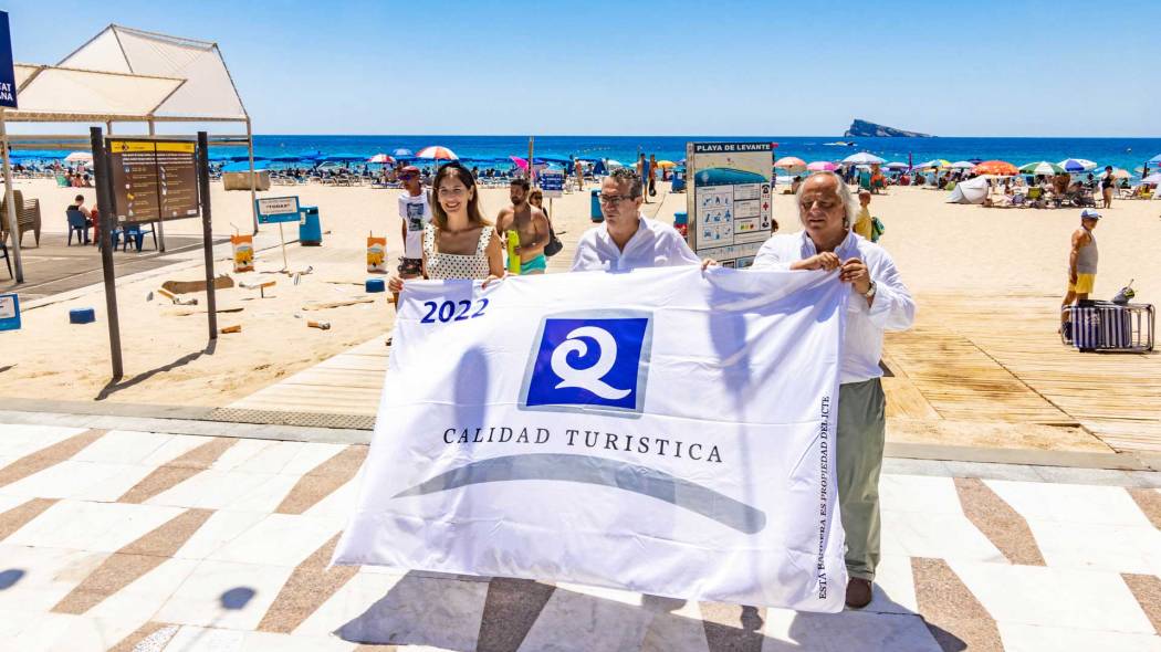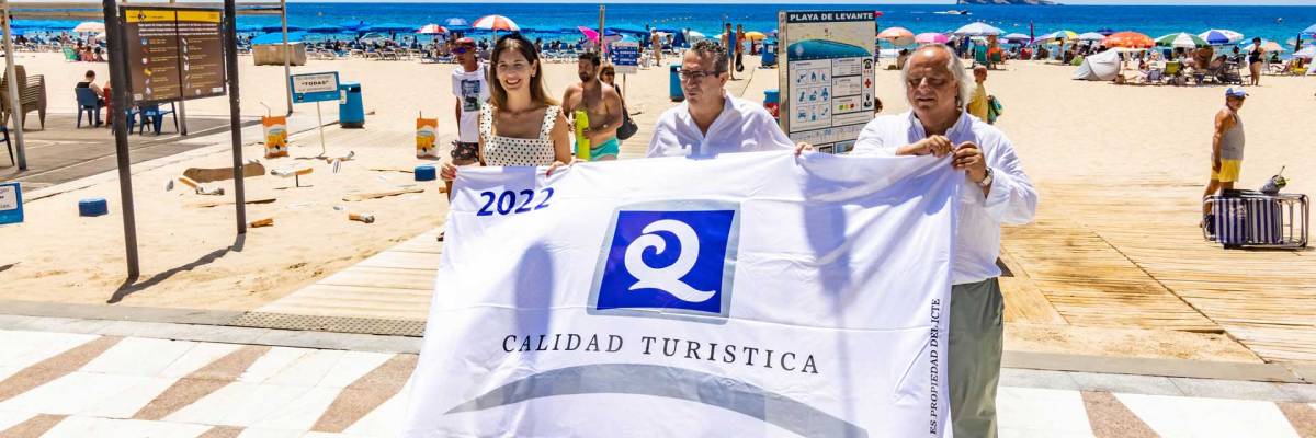 La bandera ‘Q’ de Calidad Turística ya luce en las playas de Poniente, Levante y Mal Pas. Este mediodía el alcalde, Toni Pérez, el presidente del Instituto para la Calidad Turística Española (ICTE), Miguel Mirones, y la edil de Medio Ambiente y Playas, Mónica Gómez; y los portavoces de los grupos de la Corporación han izado en la playa de Levante este distintivo que certifica la calidad de los arenales de la ciudad y de los servicios que se prestan en los mismos.