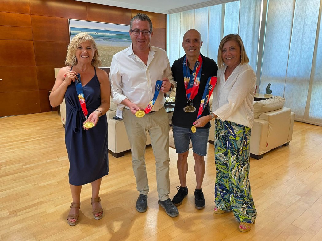 El alcalde Toni Pérez, ha recibido esta mañana al bombero benidormense Domingo Seguí Orts, “Xomi”, al regreso de su participación en los World Police & Fire Games Rotterdam 2022 donde ha conseguido 6 medallas: 2 de oro -en categoría individual en Intervención y Subida- y 4 medallas más en equipos, con componentes mexicanos: 1 de oro, en subida, 2 de plata en intervención y 1 de bronce en una nueva prueba de subida. Los equipos han sido en categoría mixta.