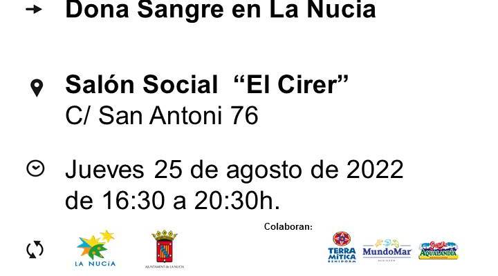 El Salón Social El Cirer acogerá una nueva donación de sangre este jueves 25 de agosto por la tarde, de 16,30 a 20,30 horas. El Centro de Transfusión de la Comunidad Valenciana se desplaza a La Nucía para realizar la decimoquinta captación de sangre de 2022. Para donar sangre no es necesario preinscribirse, ni tener carnet de donante.