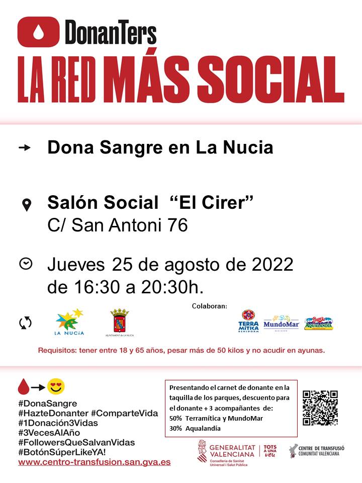 Desde la concejalía de Sanidad se recuerda que “en verano la sangre es más necesaria que nunca, ya que también hay sequía de donaciones” y que “no hay acto más solidario que donar sangre, ya que con 30 minutos de nuestro tiempo podemos salvar 3 vidas”. El Ayuntamiento de La Nucía vuelve a ceder el Salón Social El Cirer de forma gratuita al Centro de Transfusión de la Comunidad Valenciana para esta nueva “captación de sangre”.