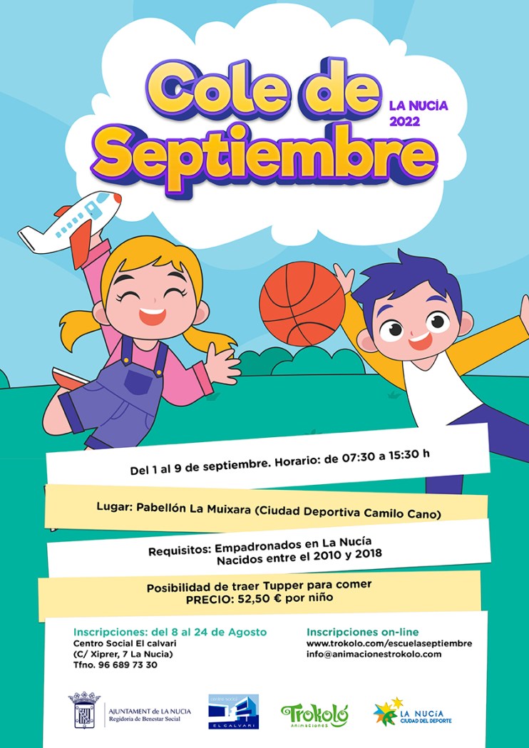 La inscripción en el Cole de Septiembre de La Nucía será del 8 al 24 de agosto en el Centro Social El Calvari, en las oficinas de la concejalía de Bienestar Social o bien vía online en: www.trokolo.com/escuelaseptiembre