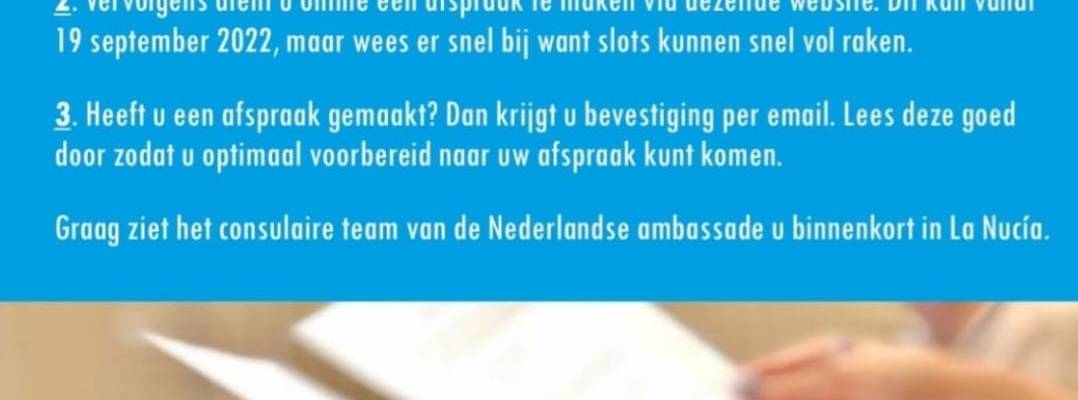 El equipo consular de la embajada de Países Bajos de Madrid visitará La Nucía del 17 al 21 de octubre de 2022, para que los residentes holandeses puedan solicitar o renovar el pasaporte y documento de identificación personal.