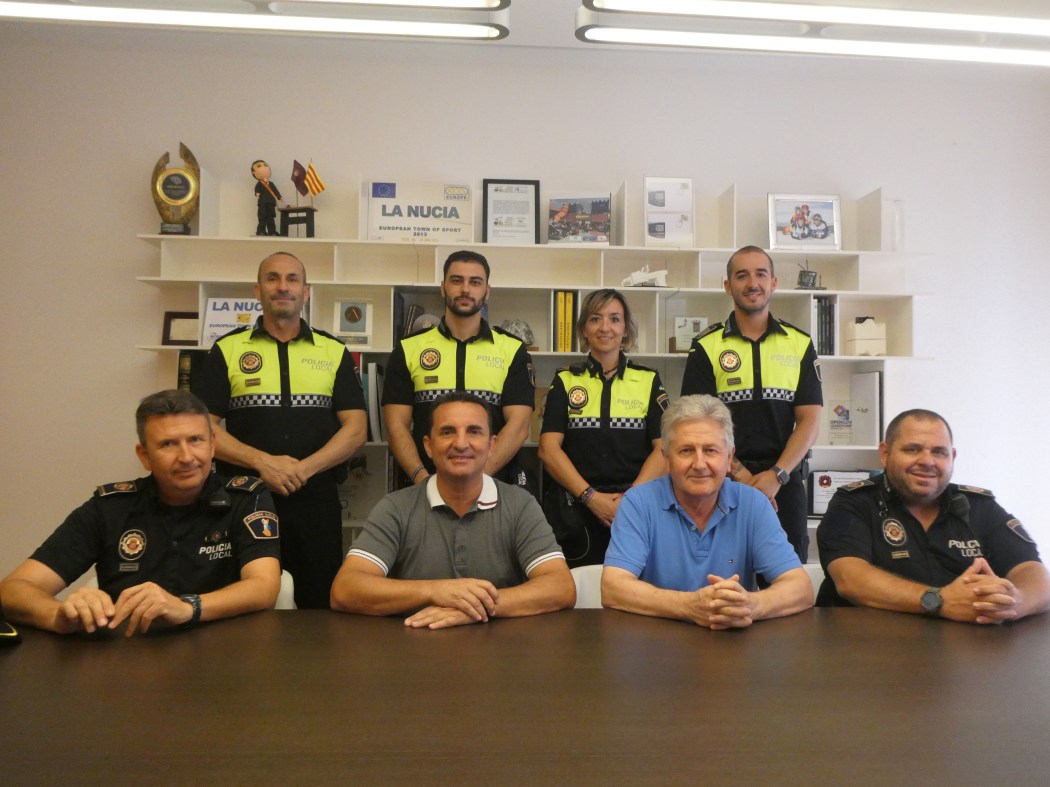En el acto de la firma del acta junto a los cuatro agentes han participado Javier Burrueco, Jefe de la Policía Local, Serafín López, concejal de Seguridad Ciudadana y Bernabé Cano, alcalde de La Nucía.