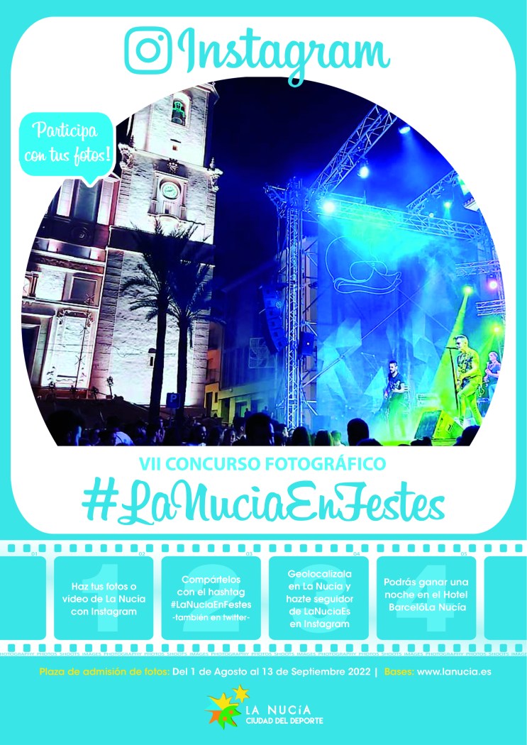 Tras dos años de parón por la pandemia en 2022 ha vuelto el Concurso Fotográfico de Instagram #LaNuciaEnFestes, con su séptima edición. El objetivo de este certamen convocado por las concejalías de Redes Sociales, Fiestas y Turismo del Ayuntamiento de La Nucia, es realizar un concurso online entre la comunidad de seguidores de @LaNuciaES, con el fin de plasmar a través de las fotos los diferentes actos de las Festes d’Agost de La Nucía 2022. El plazo de publicación de las fotos es hasta el 13 de septiembre de 2022.