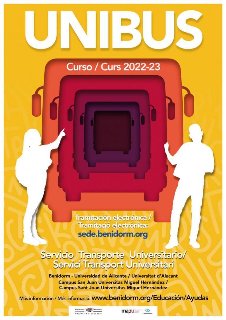 También en la Sede Electrónica y en la web del Ayuntamiento –https://benidorm.org– está disponible toda la información sobre el transporte universitario, como son requisitos, procedimiento y documentación a aportar para solicitar Unibús. Más adelante se facilitará toda la información acerca de la segunda fase del servicio de transporte, la que se prestará previsiblemente a partir del 10 de octubre