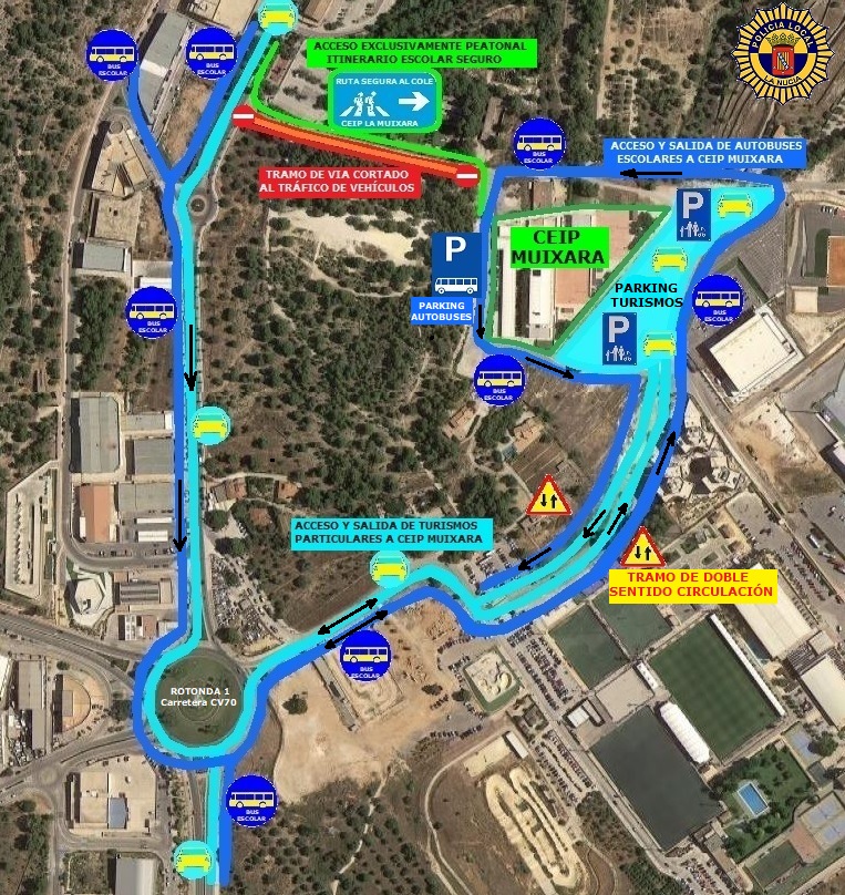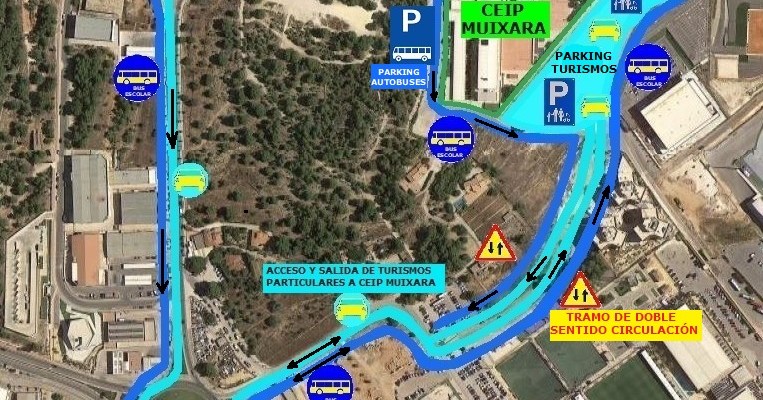 Para que el tráfico sea más fluido se ha desdoblado el vial que comunica el Pabellón Muixara con el Skate Park. Desde el Ayuntamiento de La Nucía se ruega la colaboración de toda la comunidad educativa para informar a todas las familias del Colegio Muixara, de la reorganización del tráfico acceso al centro educativo