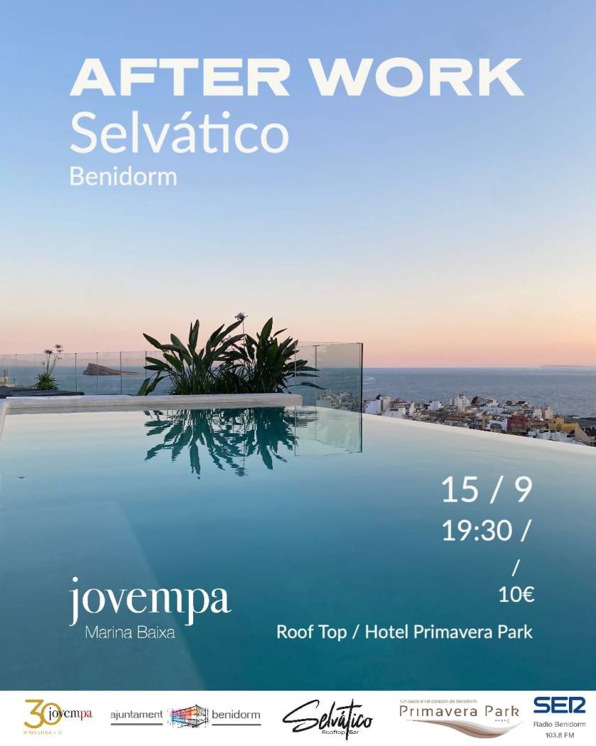 El evento organizado por Jovempa Marina Baixa en el que colabora el Ayuntamiento de Benidorm, Hotel Primavera Park y Radio SER Benidorm y está enfocado y organizado por y para los empresarios de la comarca de la Marina Baixa. Tendrá lugar mañana jueves día 15 de septiemre a las 19:30h en Selvático Benidorm, ((Rooftop bar del Hotel Primavera Park, Benidorm) ) con un precio de entrada de 10€ asociados a Jovempa Marina Baixa.