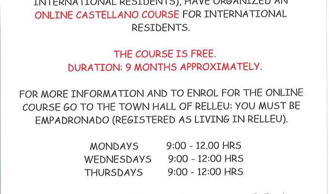 J.M.P. El Ayuntamiento de Relleu informa que, el Departamento de Residentes Internacionales de la Diputación de Alicante, ha organizado un curso de español online para residentes internacionales. La duración del mismo será de 9 meses aproximadamente. El curso es gratuito. Para poder inscribirse es necesario estar empadronado en Relleu. Los días para poder inscribirse en el Ayuntamiento son: Lunes, miércoles y jueves.