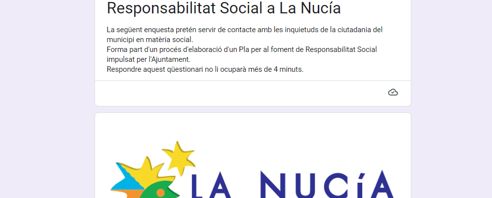 La encuesta on-line sobre “Responsabilidad Social” en La Nucía pretende servir de contacto con las inquietudes de la ciudadanía en materia social. Acción que forman parte de un proceso de elaboración de un Plan para el fomento de la Responsabilidad Social impulsada por el Ayuntamiento de La Nucía. La encuesta se debe contestar en el siguiente link: https://forms.gle/1aS3rbt3ATF9rMuG8