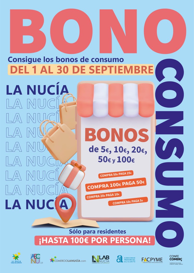 Desde el 1 de septiembre los vecinos y vecinas han podido adquirir “Bonos Consumo” de 5, 10, 20, 50 y 100 euros, a través de la web lanuciabonoconsumo.es Hasta un máximo de 100 euros de bono consumo por persona. Con estos Bonos Consumo se puede comprar y consumir en La Nucía en los comercios adheridos a la campaña únicamente durante el mes de septiembre y “ganar el doble” ya que al comprar con el “bono consumo” el valor se duplica. Porque al comprar el bono de 5 € el consumidor paga 2,5 €, de un bono de 10 € paga 5 €, del de 20 € paga 10 €, del de 50 paga 25 € y del de 100 € paga 50 €.
