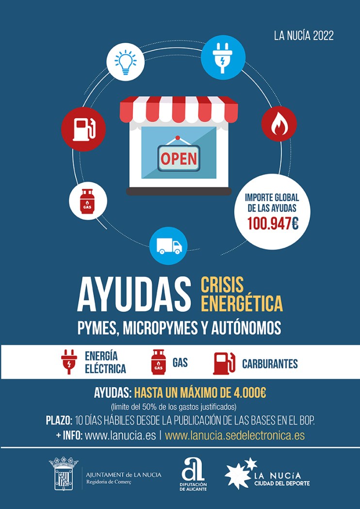 Hoy lunes 3 de octubre el Ayuntamiento de La Nucía abre el plazo de una nueva línea de “Ayudas por la Crisis Energética” para Pymes, Micropymes y Autónomos de La Nucía, dotadas con un total de 100.947 euros. Esas ayudas son para ayudar a las empresas y autónomos en los gastos de energía eléctrica, gas, carburantes. Bases, solicitud y toda la información se pueden descargar en www.lanucia.es y en https://lanucia.sedelectronica.es/info.0