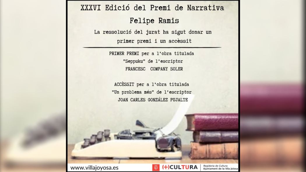 La resolución del jurado de la XXXVI Edición del Premi de Narrativa en Valencià Felipe Ramis 2022 organizado por la concejalía de Cultura del Ayuntamiento de la Vila Joiosa, ha concedido el primer premio, dotado con 1.700,00 euros, a la obra original «Seppuku», del autor Francesc Company Soler, de Ontinyent (Valencia).