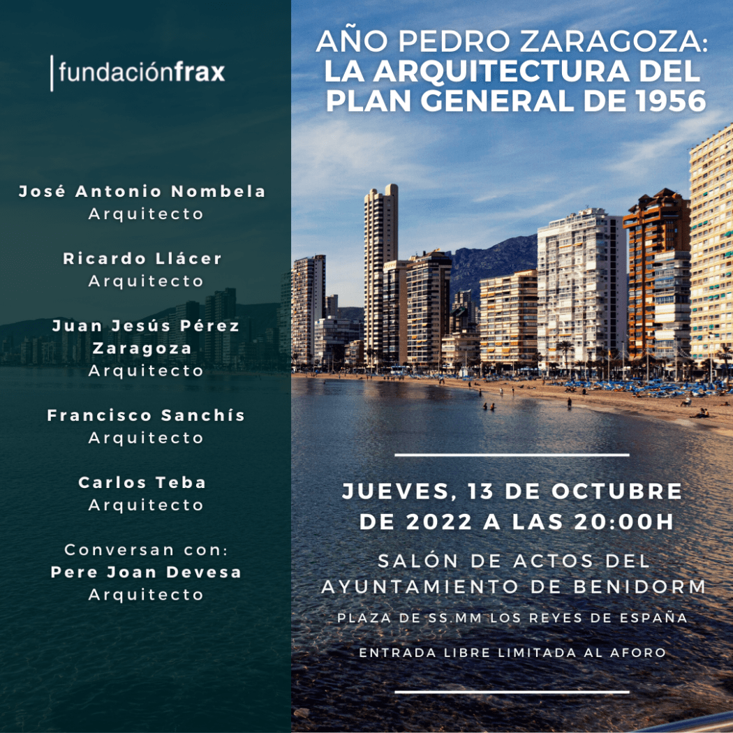Convocados por la Fundación Frax, y en el salón de actos del Ayuntamiento de Benidorm, seis prestigiosos arquitectos disertarán este jueves 13 de octubre, a partir de las 20:00 horas, sobre la figura del exalcalde benidormense Pedro Zaragoza y lo que supuso para la capital turística la aprobación de su primer Plan General de Ordenación Urbana en el año 1956.