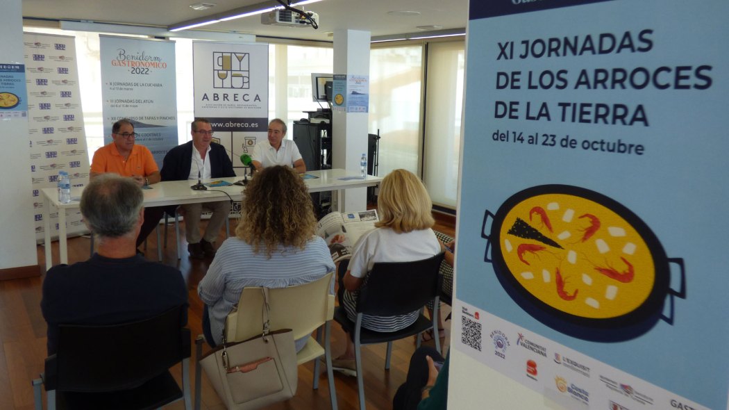 El alcalde de Benidorm Toni Pérez, junto al presidente de la Asociación de Bares, Restaurantes y Cafeterías de Benidorm, Francisco Javier del Castillo, y el padrino del Benidorm Gastronómico 2022, Manuel Ruiz Girona, ha presentado hoy las undécimas jornadas de los Arroces de la Tierra que ponen el colofón al Benidorm Gastronómico de este año.