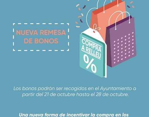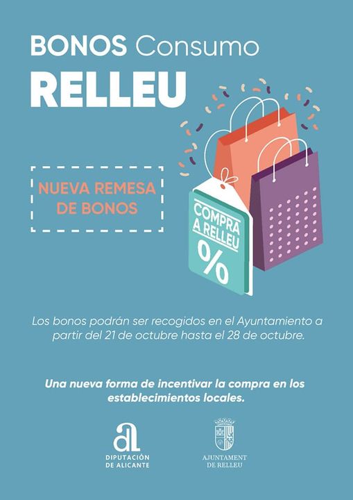 J.M.P. Desde el Ayuntamiento de Relleu, quieren agradecer la acogida que ha tenido la campaña de Bonos Consumo. Realizarán una nueva remesa hasta fin de existencias que podrán recoger hasta el viernes 28 de octubre. El plazo para consumir los bonos finalizará el domingo 30 de octubre fecha en la que finalizará la campaña.