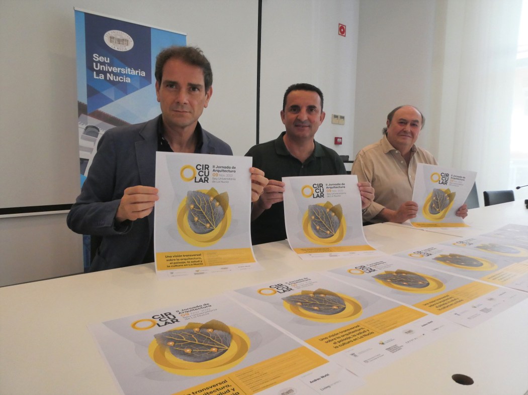 La presentación de “CIRCULAR. II Jornada de Arquitectura de La Nucía” ha contado con la presencia de José Luis Campos, arquitecto y organizador de CIRCULAR, Pedro Lloret, concejal de Seu Universitària y Bernabé Cano, alcalde de La Nucía.