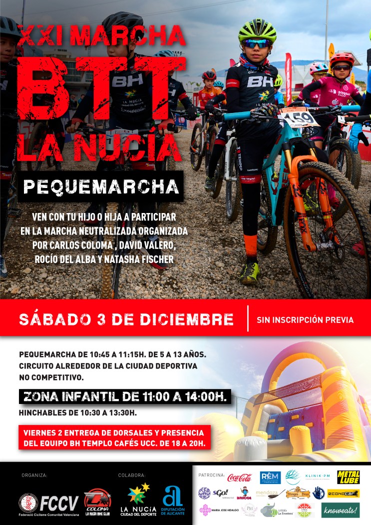 El próximo sábado 3 de diciembre se celebrará la XXI Marcha de Bicicletas de Montaña (BTT) de La Nucía, que batirá su récord de participación con 650 bikers. Esta XXI edición contará con la novedad de una “pequemarcha” infantil neutralizada para niños entre 5 y 13 años. Otra novedad será la entrega de dorsales del viernes por la tarde, donde estarán la campeona de España Rocío del Alba, la campeona de Europa Natalia Fischer, los medallistas olímpicos Carlos Coloma (Rio 2016) y David Valero (Tokio 2020), para firmas o fotografías.