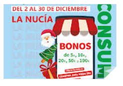 La campaña de “Bono Consumo Navidad” de La Nucía comenzará mañana viernes 2 de diciembre. Los nucieros y nucieras podrán hacer uso de esta campaña del 2 al 30 de diciembre, en los 57 comercios adheridos a la campaña y que su dinero “valga el doble”, ya que al comprar con el “bono consumo” el valor de su dinero se duplica. Es la segunda campaña que se realiza tras el gran éxito que tuvo su primera edición en el mes de septiembre.