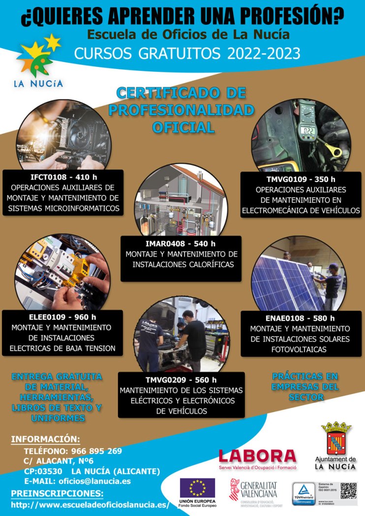 Para el curso 2022-2023 la Escuela de Oficios de La Nucía oferta seis cursos para desempleados, con un total de 90 plazas, 15 por curso. De las que sólo quedan las últimas plazas. Las inscripciones se pueden realizar a través de la web: http://www.escueladeoficioslanucia.es/
