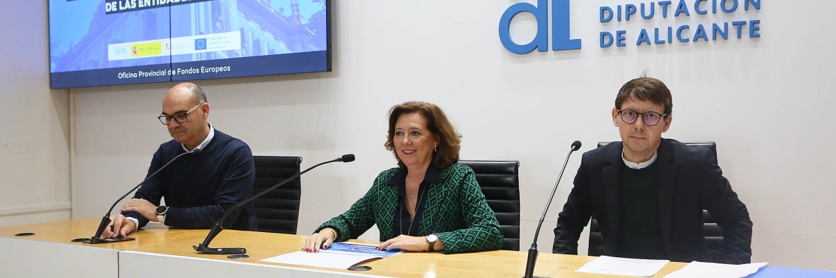 La diputada de Proyectos Europeos, María Gómez, el director de Suma Gestión Tributaria, José Antonio Belso, y el director de CENID Alicante, Manuel Palomar, han presentado esta mañana todos los detalles de este programa, financiado íntegramente por la Unión Europea y dirigido a municipios de menos de 20.000 habitantes.